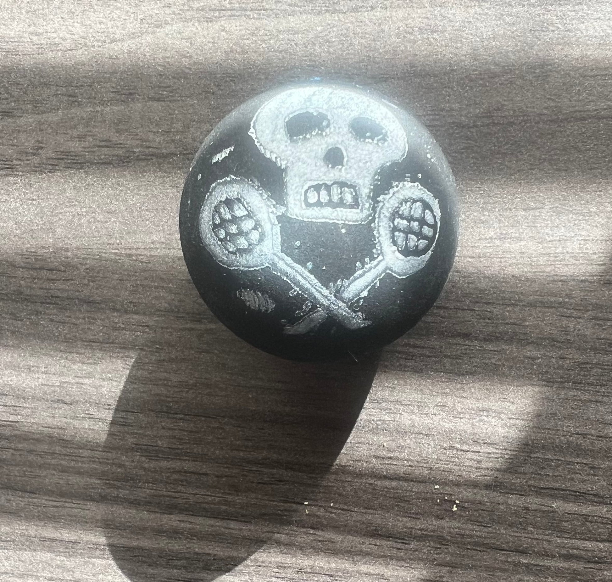 An actual squash ball with the "skull & rackets" logo printed on it